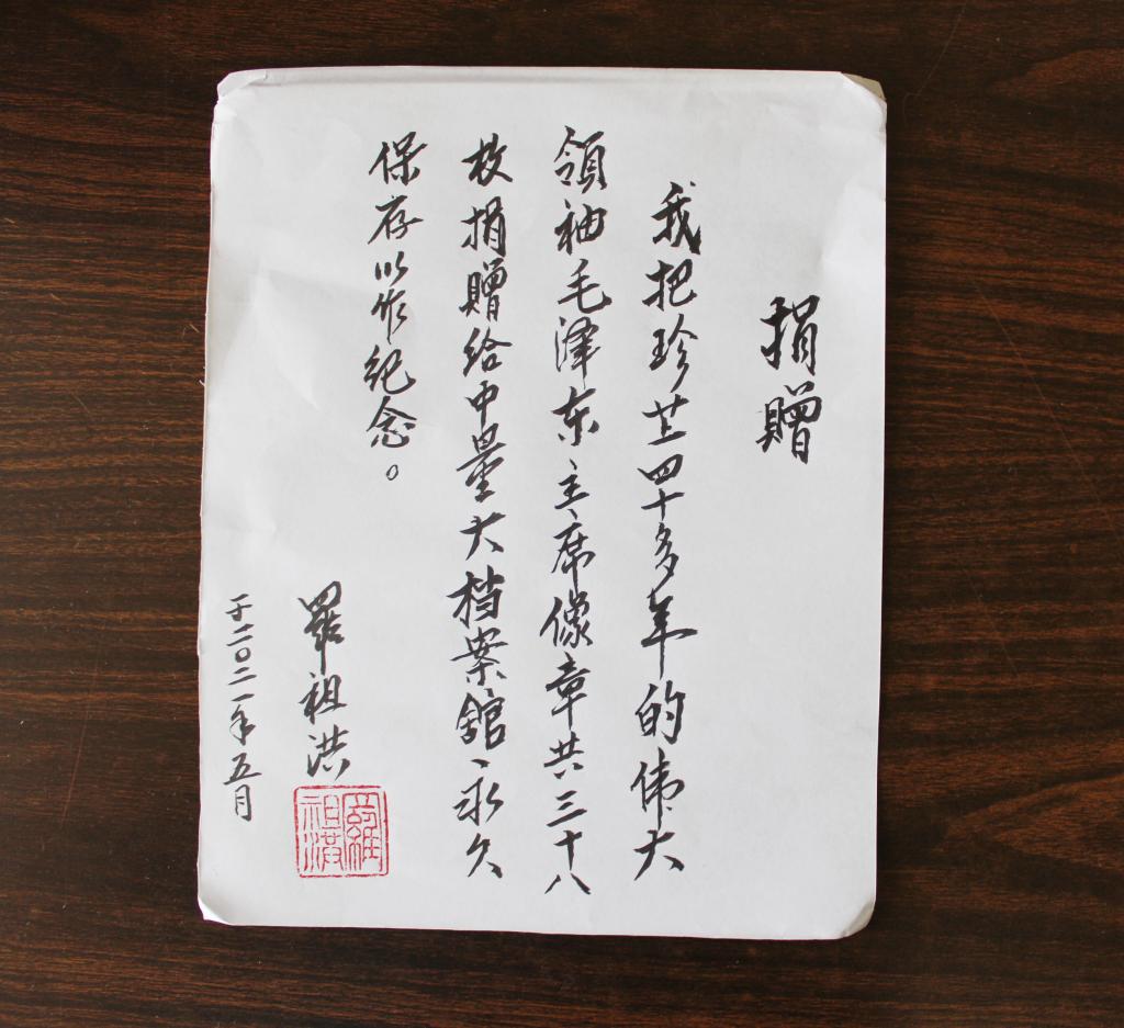 5月24日上午,88岁高龄、67年党龄的中国计量学院原副院长罗祖洪同志应邀作题为《学党史 悟思想 谈感想——我的计量情怀》老党员专题党课。报告前,罗祖洪将珍藏40多年的38枚伟大领袖毛泽东主席像章亲自交到校档案馆馆长郎杰斌手中,捐赠给档案馆永久保存。